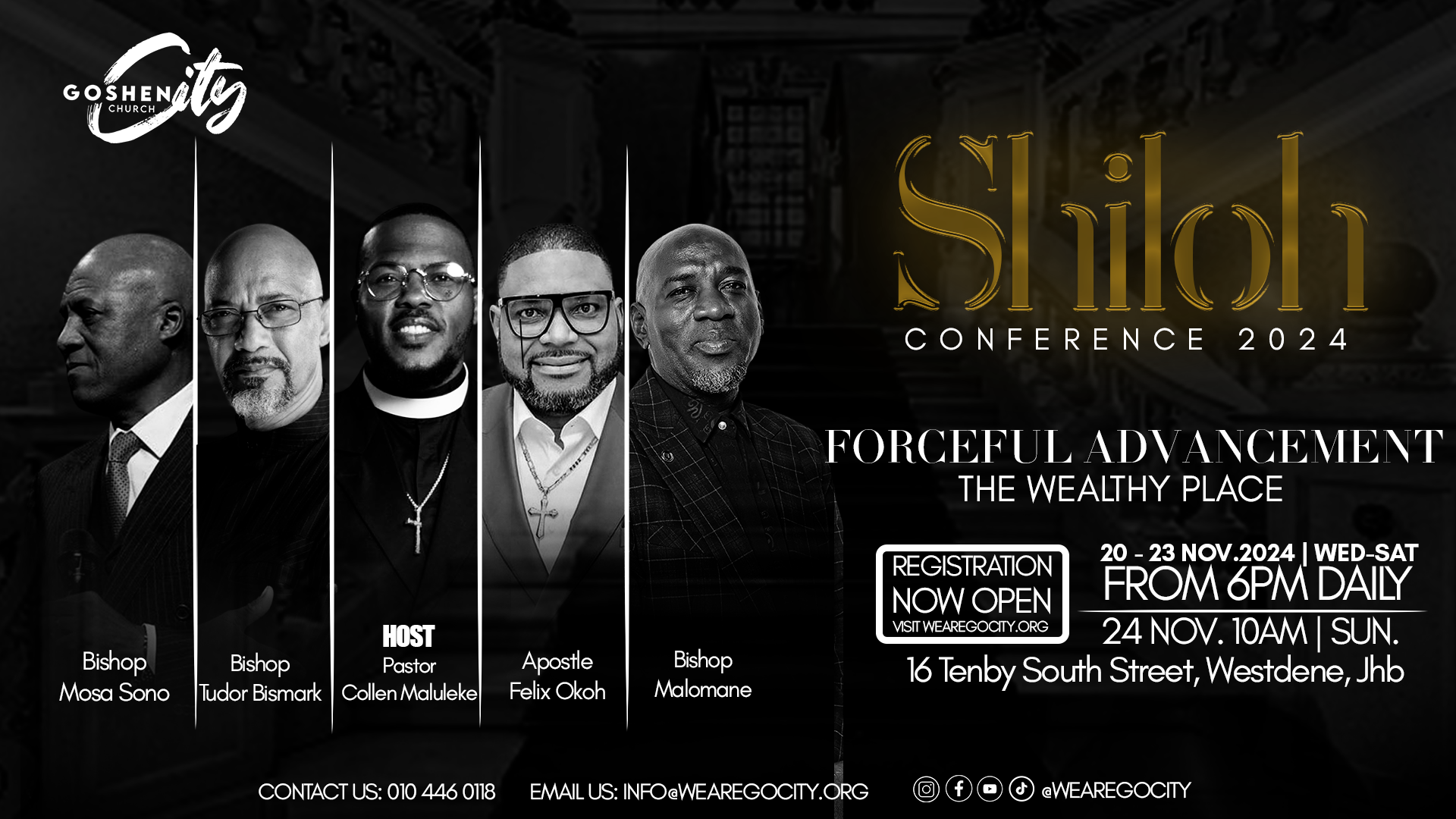 Goshen City Church 16 Tenby S Street, WestdeneShiloh Conference 2024: Forceful Advancement – The Wealthy Place Hosted by Goshen City Church, this year’s Shiloh Conference promises to be a life-transforming experience as we delve into the theme of Forceful Advancement in The Wealthy Place. Join us from 20th to 24th November 2024 for five powerful days of spiritual impartation, worship, and teachings.… Read More »Shiloh Conference 2024